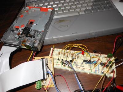 Floppy MusicPosted: May 2009 Introduction So I saw other people doing this on YouTube and I wanted to be cool like them and do it too. Basically what I'm doing here is shaking the hell out of a floppy disk head at certain frequencies to make music. I was originally going to do this with 2 floppy drives so they could each play a part of Bach's Invention 13 from the midi file I used in my SID Player project. Unfortunately because of the way floppy drives work, this wasn't possible while having two drives on the same cable and I didn't have room on my PC board (or the patience) to solder another floppy connector. Anyway, if you want to hear an example of what this sounds like I have a video on YouTube: Update May 20, 2012: I made a new version of this circuit that takes input from my guitar and vibrates the floppy disk head based on input from the guitar. Sound files and/or video coming soon... Related Projects @mikekohn.net Video Here's a video of the floppy drive playing Bach's Invention 13. https://youtu.be/beNCUsfpvYc Pictures May 2009: Here is a picture of the original MIDI Atmel ATmega168 circuit that I made in May of 2009 attached to a floppy drive. May 2009: Schematic of the original ATmega168 MIDI circuit. Someone pointed out to me I didn't show power connections on the floppy. The floppy drive is powered from a separate cable. It requires a 12v connection on the yellow wire and 5v on the red. If anyone has any questions feel free to email me. May 20, 2012: This is my MSP430 version of the circuit that crosses the original circuit with my MSP430 guitar processor. May 20, 2012: This is the schematic for the guitar controlled floppy circuit. Btw, this isn't very healthy for a floppy drive. I actually destroyed a floppy drive doing this :). Also, the quality of the drive really affects the sound. The drive I destroyed actually had a pretty nice sound and kept the notes in tune suprisingly well. The floppy drive in the video above is a piece of crap from an old Gateway 2000 computer. The notes were kind of sound out of key sometimes. I had a third drive that was made by TEAC that was so high quality it was almost dead silent. TEAC made some of the best drives around in my opinion. Original Circuit Explanation Basically it works like this: all the odd pins on the floppy drive cable are connected to ground. Since all I was doing was playing with the stepper motor, I didn't need any of the drive's output connections to the inputs of the micro since I wasn't reading anything, but I hooked up the index and track 0 pin anyway for fun. For microcontroller I used the Atmel ATmega168. Probably if I were to redo this project I would use a smaller chip such as the ATtiny2313 since it only requires 1 Vcc and 1 Gnd, it would save space on the board and would be easier to wire it up. Unfortunately, back then I was pretty much only using the ATmega168. For output pins on the micro to the floppy drive I used PD2 for density select (always high if I remember right), PB0 for motor on, PB1 for drive select B, PB2 for drive select A, PB3 for motor B on, PB4 for direction, and PB5 for a step pulse. All these lines are reverse logic so setting them low selects the signal. For example if I wanted to make floppy drive A's motor spin, I'd clear the PB0 output pin setting it low. My firmware doesn't touch any of the drive B pins for reasons I'll explain later. So for my circuit I was trying to make the floppy head move back and forth and different speeds to create music. For example if the head moved back and forth at 440 steps a second it would be an A440 note. I originally tried to move the head up and down from track 0 to 80 and back to 0 at different speeds to create tones, but it was too quiet, so I decided to just move the head back and forth by 1 track. To move the head I simply set the direction pin (PB4) low or high depending on which direction I want to move the head, set the drive select A pin low (PB2), and set the step pulse (PB5) low for at least 1ms. Unfortunately the drives don't have any latches, which is the reason why I couldn't control 2 drives from a single cable to make music. Drive select and the step pulse have to be kept low for each drive for at least 1ms. Switching to drive B during this time is not an option. So in order to make this chip play songs, I made the microcontroller connect to a computer via an RS232 and accept MIDI commands. So basically to make the chip play a middle C the computer would send 0x90 60 127. To turn off the note 0x80 60 0. I modified the midi player I wrote for the SID player project to echo the MIDI commands it parses out to the micro instead of sending the commands I used to control the SID. Guitar Ciruit Explanation Since I noticed that everyone and their mother is now creating floppy disk music circuits, I decided I wanted to try something different. This circuit and firmware is pretty simple really. It takes the input from my guitar, raises the voltage by half of 3.3v (since 0v to 3.3v are the rails to the reference voltage), puts this signal into the A/D converter of an MSP430G2231, and if the number read in is above 512+threshold, it moves the head 1 step. This makes the floppy disk head vibrate at the speed of the string. Probably the most tedious part of this circuit is that since the microcontroller runs at 3.3v and the floppy disk is 5v, it takes 1 transistor per input / output to interface the drive with with the micro. The source code below can be assembled with naken_asm. Source Warning this code is in terrible shape. Since it was originally going to use two drives I wrote most of the code for it and didn't remove or a lot of debug code and commented out code I might want to keep.