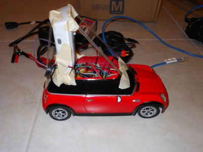 Mini Cooper XbeePosted: July 4, 2016 Introduction I wanted to play around with some XBee modules so I figured another little radio control car circuit might be fun. Like some other R/C car circuits I did before, I picked out a cheap R/C car, this time a Mini Cooper S, ripped out their radio control circuit, and replaced it with my own. To control the car I have software written on a PC using SDL that takes input from the gamepad and sends commands over another XBee to the car. The software also reads from an IP camera and draws the video in the display window. Update: September 13, 2018: I reworked the firmware so it could drive based on specific patterns and input from a proximity detector on the front. I posted a new video of that below the old one. Related Projects @mikekohn.net