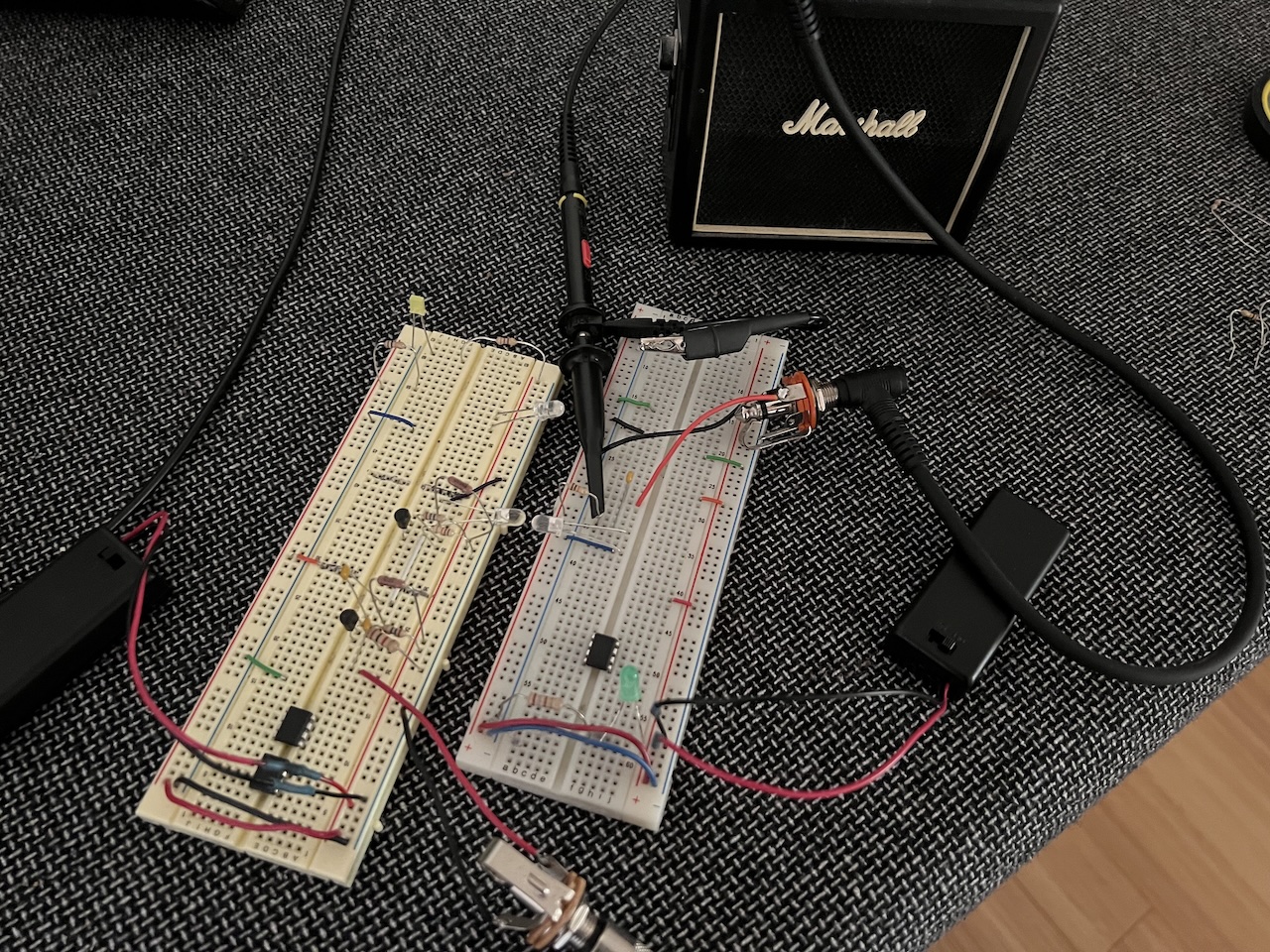 The sound of this circuit with the IR emitter was also.. not my favorite. It wasn't the IR emitter at fault, even with only the two bipolar transistors it sounded cheap, but it really needs some tuning to get a nicer sound. Either way, the IR emitter is probably kind of pointless anyway. Well, not totally pointless since if the neck of my guitar got struck by lightning while I was playing, my guitar amp would be protected from damage due to optoisolation.