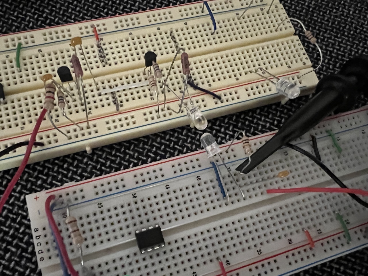 Above is the main setup for this project. A Mini-Marshall battery powered guitar amp is used for the sound output. The breadboards have some extra things on them that aren't connected... but the main circuit here can be seen: two 2N3904 transistors and the IR circuit. An oscilloscope probe is connected to the phototransistor.